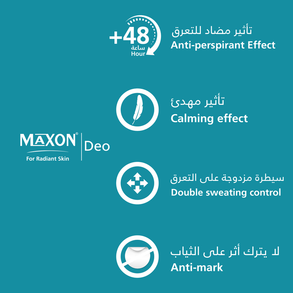 نقدم لكم MAXON Deo Roll-On، وهو حل قوي مصمم لكل من يسعى إلى الحفاظ على النضارة ومكافحة الروائح الكريهة تحت الإبط طوال اليوم. تم تصميم هذا الرول الذي تم تركيبه من خلاصة الصبار المهدئة والبانثينول، لتلبية احتياجات جميع أنواع البشرة، مما يوفر طريقة لطيفة وفعالة للنظافة الشخصية.