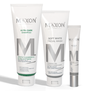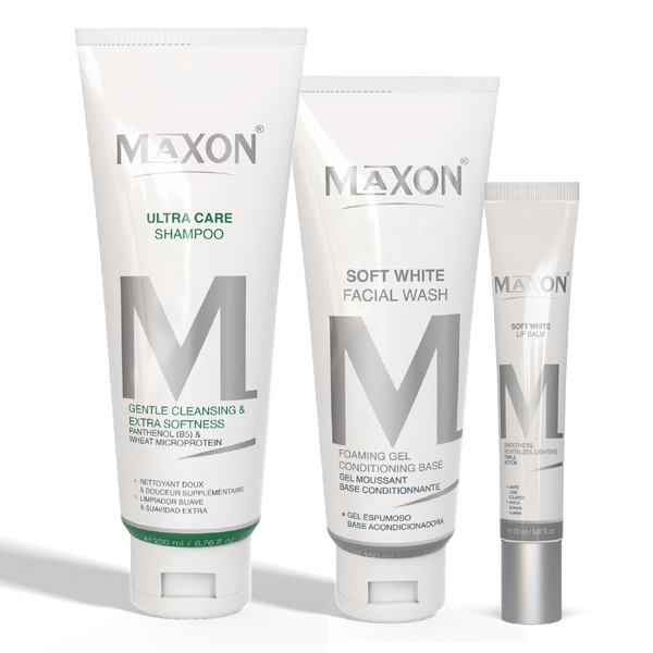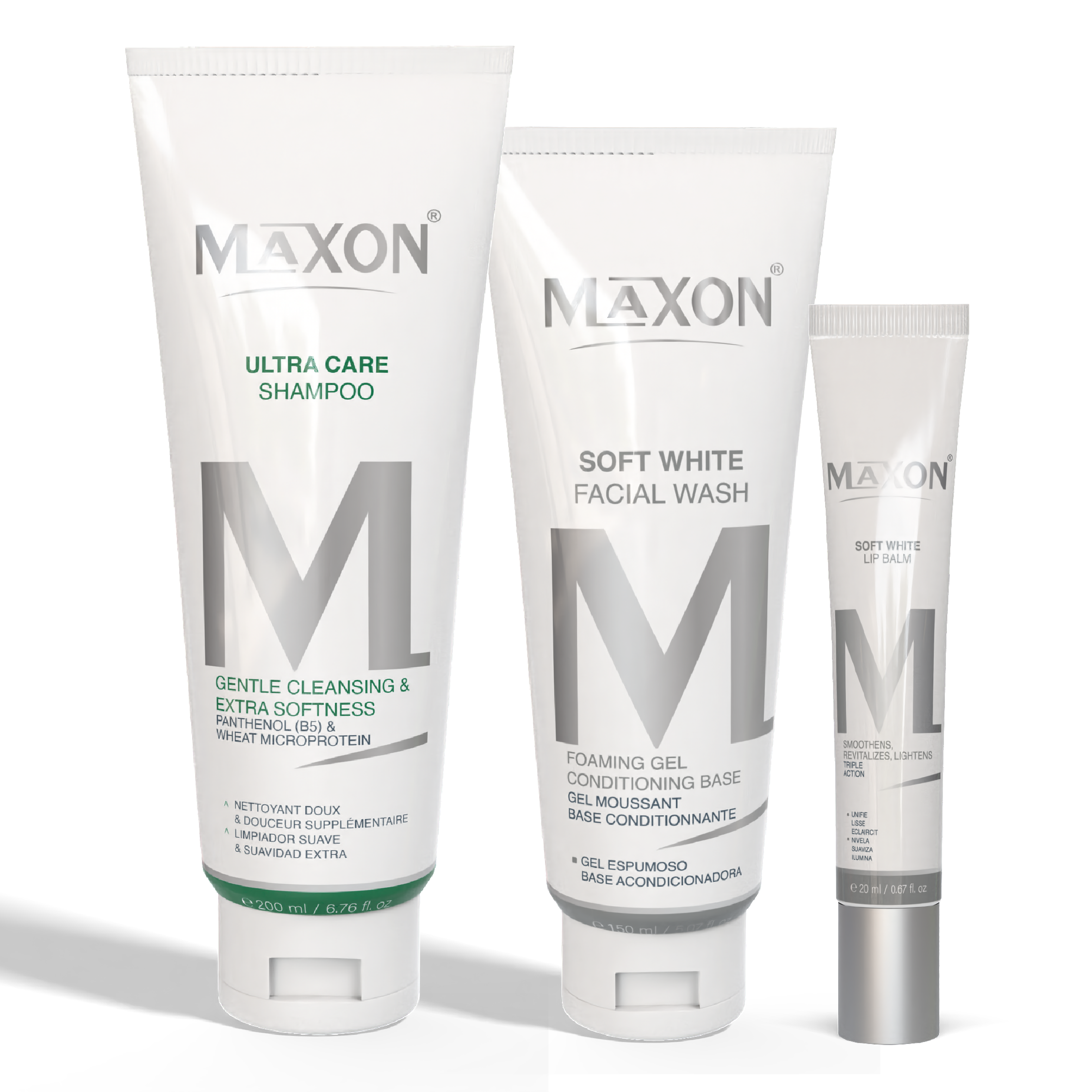 Begin with the Maxon Soft White Facial Wash, a gentle foaming gel that deeply cleanses, removes excess oil and makeup, and reveals a clearer, more radiant complexion. Follow with the Maxon Soft White Lip Balm, formulated with Alpha Arbutin and Kojic Acid to target lip pigmentation while delivering deep hydration and sun protection. Finally, nourish your hair with Maxon Ultra Care Shampoo, powered by panthenol, wheat microprotein, and chitosan to cleanse, repair, and restore softness and strength.